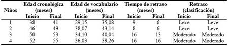Al realizar el IPP, se constató que en el 75 % de los niños disminuyó el tiempo de retraso, a pesar que desde el punto de vista cualitativo siguió encontrándose el 50 % de niños con retraso del lenguaje leve, y el otro 50 % con retraso del lenguaje moderado. (Tabla 1).