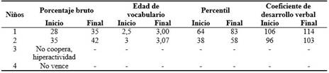 Los resultados del PPVT evidenciaron una mejoría evolutiva: el 50 % de los niños logró elevar su coeficiente de desarrollo verbal. Un 25 % no venció el test, y el otro 25 % no cooperó en la realización de la prueba por presentar problemas de hiperactividad. (Tabla 2).