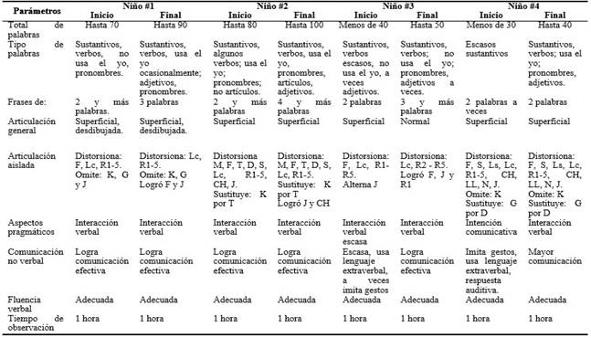 Results: advances in children’s language development were evidenced, both from a qualitative and quantitative point of view. Likewise, a greater understanding and commitment of the families in complying with the guidelines received for the speech therapy care of their children was appreciated.