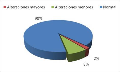 En el actual estudio, las alteraciones menores estuvieron presentes en 4 pacientes (8 % del total estudiados), porcentaje también inferior al encontrado en el estudio realizado en el período 2006-2010 en Matanzas.4