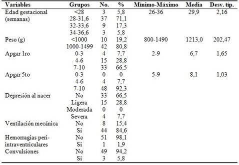 La edad gestacional promedio de los neonatos estudiados fue 29,9 semanas, y el peso al nacer promedio, 1213 g. Hubo un predominio de los neonatos con edad gestacional entre 28 y 31,6 semanas (71,1 % del total) y 80,8 % correspondieron al rango de peso al nacer de 1000-1499 g. Aunque poco más de la tercera parte de los pacientes estudiados presentó un puntaje de Apgar bajo en el primer minuto de vida. La gran mayoría (92,3 %) presentó una puntuación normal (≥ 7) a los 5 minutos de nacidos. La mayoría de los pacientes requirió de ventilación mecánica (84,6 %) y solo un paciente (2 %) presentó hemorragia intraventricular en el período neonatal. (Tabla 1).