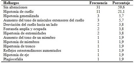 Los hallazgos específicos durante el examen neurológico al término mostraron a la hipotonía de cuello como la alteración más frecuente (21,1 %), mientras que la hipotonía generalizada y la hipertonía de los músculos extensores del cuello le siguieron en orden de frecuencia, con 5,7 % cada una. (Tabla 2).