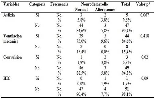 Fueron las convulsiones el factor de riesgo neurológico que mayor asociación tuvo con la ocurrencia de alteraciones del neurodesarrollo en los RNMBP que conformaron la serie.