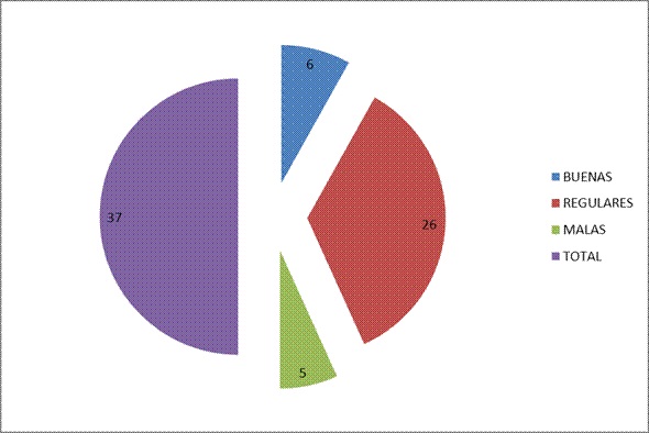 El mayor número de viviendas se clasificaron como regulares, con un total de 26 que representa el 70,2 %. (Gráfico1).
