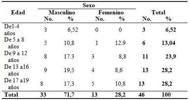El estudio incluyó 46 niños con edades comprendidas entre 1 y 19 años. El menor grupo correspondió al de 1 a 4 años representado por el 6.52 %, mientras el grupo de 13 a 16 años y el grupo de 17 a 19 años representaron el 28,2 % respectivamente. En todas las edades fue el sexo masculino el más afectado representado con el 71,7 % del total. (Tabla 1).