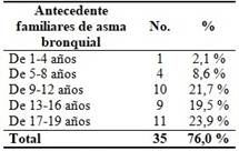 El presente estudio abarcó un total de 35 niños con el antecedente familiar de esta enfermedad que representa el 76 % de la población estudiada. Solo 11 niños con el diagnóstico de asma bronquial no tienen el antecedente familiar de la enfermedad.