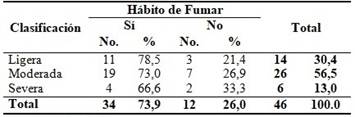 Al analizar la relación existente entre el tipo crisis de asma bronquial de los niños y la exposición al hábito de fumar, teniendo en cuenta cualquiera de sus categorías, se comprobó que 34 infantes (73,9 %) estuvieron expuestos. El grupo clasificado con crisis moderada fue el que predominó con un 56,5 % de estos expuestos al humo del cigarro. (Tabla 3).
