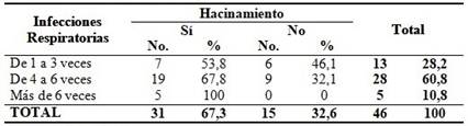 Del total de los niños estudiados 31 presentan hacinamiento en sus hogares. Analizando esta variable y la frecuencia de infecciones respiratorias padecidas en el año se pudo observar que el total de niños que se enferman más de seis veces al año, presentan hacinamiento y el 64, 7 % de los que la padecen de cuatro a seis veces. (Tabla 4).