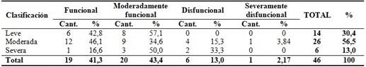 Del total de los niños estudiados hubo un predominio de niños con crisis moderada persistente representando un 56,5 %. Predominaron las familias moderadamente funcionales y dentro de estas, en nueve casos las crisis fueron también moderadas. Seis niños sufrieron crisis graves y el 50 % correspondió a infantes con familias moderadamente funcionales, dos a familias disfuncionales y solo uno a familia funcional. (Tabla 5).