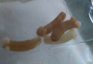 Se extrajeron además fragmentos de otros clips (pocas semanas antes el paciente había expulsado por la sonda una masa amarillenta, gelatinosa, no sugestiva de pus). (Fig. 3).