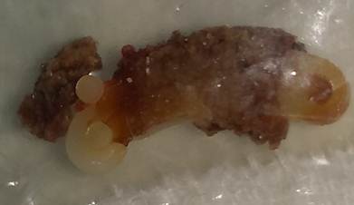 Se retiró la sonda, pero presentó síntomas de vejiga hiperactiva (disuria, polaquiuria (orinas escasas y muy frecuentes), emergencia miccional, incontinencia urinaria, tenesmo vesical, todo lo cual obligó a recolocar la sonda urinaria. Se esperaron 45 días para restablecer la mucosa urinaria de los efectos de la radioterapia y poder hacer la extracción. El 14 de junio del 2021 se realizó la extracción del cuerpo extraño, que estaba adherido a la pared de la vejiga y resultó ser un clip calcificado. (Fig. 2).