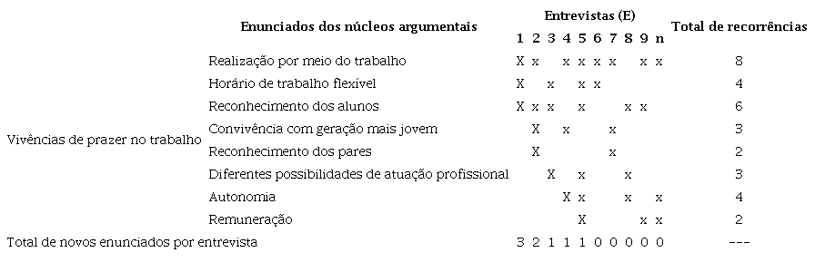No Quadro 1, ilustra-se como esse processo foi realizado com um dos temas investigados – vivências de prazer no trabalho – por meio de exemplo hipotético que utiliza parte dos dados da pesquisa. Na situação retratada no quadro, a saturação para as vivências de prazer no trabalho ocorreu na quinta entrevista. Ressalta-se que o registro das recorrências foi utilizado apenas para verificar a saturação, visto que para a construção da narrativa foram considerados todos os núcleos argumentais, conforme descrito mais à frente.