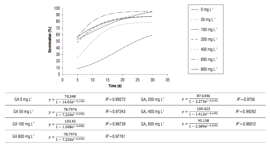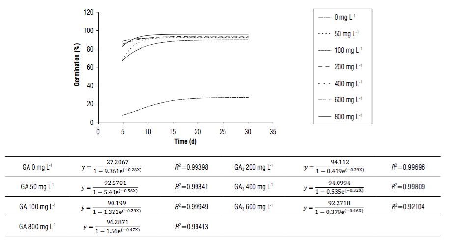 With the application of 200, 400, 600, and 800 mg L-1 GA, the better PG responses were observed during the incubation period. Under these concentrations, the germination patterns were similar, with values of PG much higher than found for the treatment of 0 mg L-1 GA in the first 5 d of incubation (86.4, 85.6, 89.6, and 84.8%, respectively). The shortest time to reach the maximum PG was obtained with the application of 600 mg L-1 at 16 d GA (PG = 92.3%), followed by 800 mg L-1 GA to 17.7 d (PG = 96.3%). The treatments of 200 and 400 mg L-1 GA obtained maximum PG values at 22 d of incubation (PG = 94.1%). For the same concentrations, geometric progression of PG or accelerated growth of this variable was presented during 1st d of incubation.