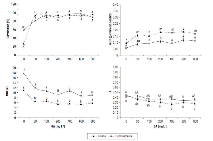 With respect to the patterns of germination, GA treatments of seeds increased PG at each time point of incubation as the effect of large increases initial germination rates and shorter times to reach maximum PG, which was more pronounced in seeds from Tolima.