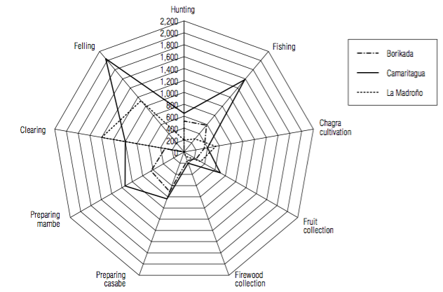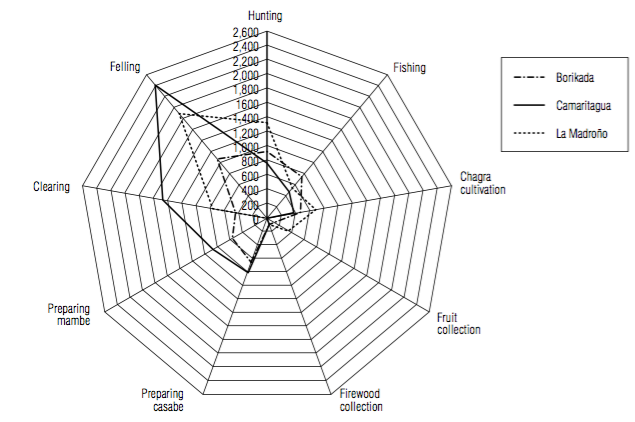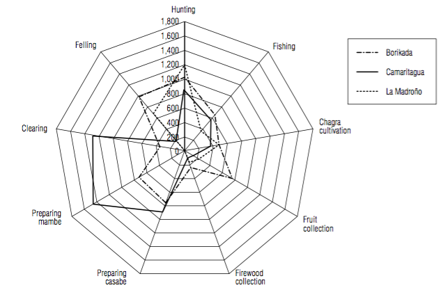 Figure 6 also demonstrates that the epoch with the most investment of effort in Camaritagua was January, while for Borikada and La Madroño, it was June. This is logical because Borikada and La Madroño are river communities with island chagras that demanded increased effort in this epoch to harvest the chagras before flooding. In contrast, Camaritagua had most work in January because of hunting, fishing and fruit collection for the Dance of the Doll (FUCAI et al., 2001) and they do not have island chagras because they are on the riversides.