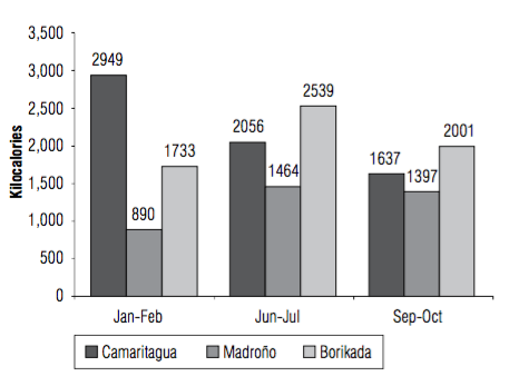 In La Madroño, a similar couple would expend 1,780 kcal/ day (between man and woman) to maintain their way of life during January-February, 2,928 kcal/day during the rainy season, and 2,764 kcal/day for September-October.