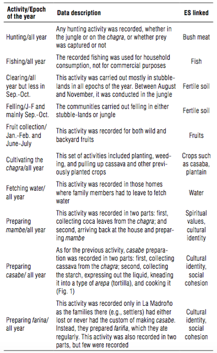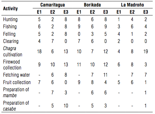Table 2 provides a brief description of the recorded activities. Not all activities were carried out in the three recording periods, as these depended on the ecological calendar, which is very similar for the communities in the lower Caqueta.