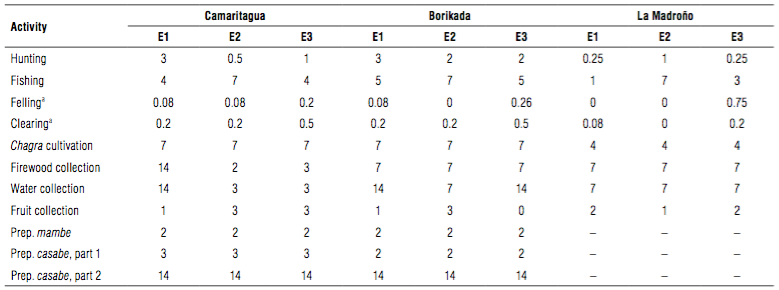 According to Van der Hammen (1992), SantoDomingo (2011) and Cardona (2015) communities in the lower Caqueta river Basin depend on subsistence, mainly natural resources from the forests and rivers by fishing, hunting and cultivating chagra, so a sample of three families (volunteers) in the three communities that participated was used to measure the value of invested effort in each activity (Tab. 1).