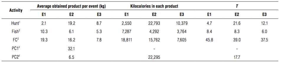 Values of .were determined for each subsistence activity, using the average value between the three communities in each activity by season, also the field forms included data of the obtained product (Tab. 6).