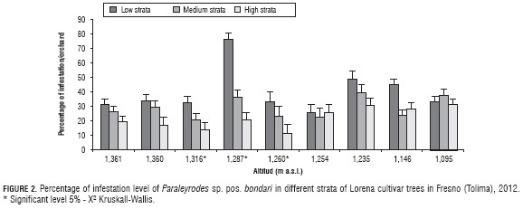 No statistically significant differences were found in percentage of infestation of P. pos. bondari nymphs on low, medium and high strata leaves on 'Hass' avocado trees between orchards evaluated. Conversely, 'Lorena' crops showed significant differences of whitefly infestation levels between strata (P<0.05) from different orchards (Fig. 2). Nevertheless, in general, we found more whitefly infestation (8/11) on the low strata per avocado crops in Fresno, Tolima.