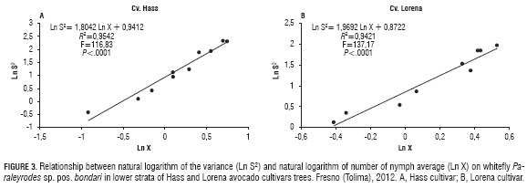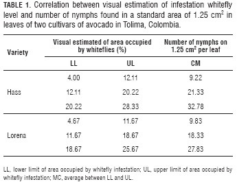 Equivalence correlation between percentage of whitefly nymphs found in 1.25 cm. per leaf was significant for both cultivars; 'Hass' (P = 0.0001; R. = 92) and 'Lorena' (P = 0.0001, R. = 84), this allowed for field nymph counts based on area occupied by whitefly colonies (Tab. 1).