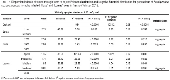 Because in this present study, variance of counts data of whitefly nymphs was greater than mean, the best-fitting model was Negative Binomial distribution (Tab. 2). In avocado crops of Fresno, Tolima, the spatial distribution of P. pos. bondari nymphs was "highly aggregated" with preference to buds located at 120° north (K=0.09) followed by prebasal leaves (K=0.11) (Tab. 2).