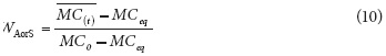where MC0 is the water or solid content at the beginning (g); MC(t) is the water or solid content in the time instant t (g); MCeq is the amount of water or solids in equilibrium (g), obtained from the model of Azuara et al. (1992) with Eqs. 6 and 8 .