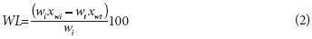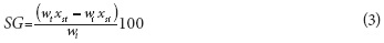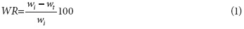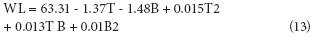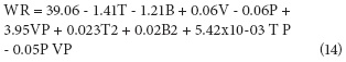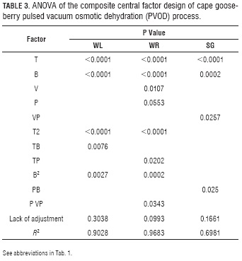 While Tab. 3 shows the ANOVA, equations 13 to 15 show the fitted models for WR, SG and WL in function of the factors. The R. (> 0.90) obtained for WR and WL suggests that these polynomial equations adequately represented the existing relationship between responses and factors with statistically significant effects (P≤0.05), while the R. for SG (0.6981) was the less representative value.