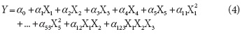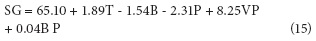 Where Y are the response variables (WR, WL or SG), a. are the model parameters and X., X., X., X. y X. are T, B, V, P and VP factors, respectively.