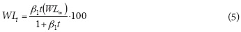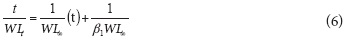 where WL. is the water/weight loss at time t, WL. is the corresponding quantity at infinite time (i.e., at equilibrium) and β. (min-1) is the constant related to the rate of diffusion of water out. The equilibrium water loss (WL. and model constant β. were estimated from the slope and intercept of the plot (t/WL.) versus t (min) equation (6).