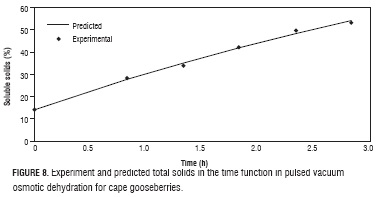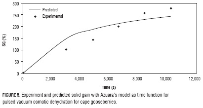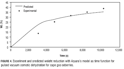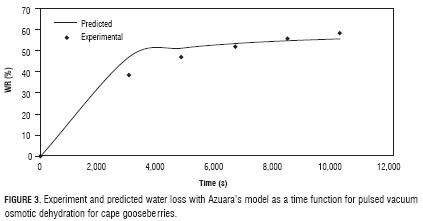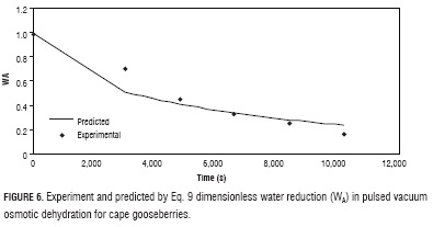 Experiment data setting of WA and WS (Figs. 6 and 7) with equations 9 and 10, delivered the values of the effective diffusivity for water reduction and solute gain, Def, a = 1.47 x 10-9 and Def, s = 1.25 x 10-9, with MRPE of 11.46 and 20.20, respectively. The higher value of Def,s with respect to Def,a can be explained with base in opening of the fruit pores by effect of the vacuum pulses, which when atmospheric pressure is restored, are filled with the osmotic solution accelerating the solid gain (Huayamave and Cornejo, 2005; Arreola and Rosas, 2007). These values are in the same magnitude order of typical values reported in literature for different fruits and vegetables (Giraldo et al., 2004; Maldonado et al., 2008; Melquíades et al., 2009; Rastogi and Raghavarao, 2004).