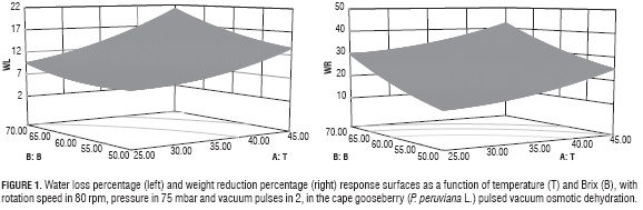ANOVA's composite central factorial design (Tab. 3) showed factors with a significant effect on the WR and WL variables, which are: T in its lineal (P<0.0001) and quadratic (P<0.0001) term, with negative and positive effects, respectively (13 and 14). Likewise, B significantly affected WR and WL in their lineal term (P<0.0001), with a negative effect on both variables. B, in its quadratic term, had a higher significance on WR (P=0.0002) than on WL (P=0.0027), but, in both cases, the effect was positive. The B effect is explained by the osmotic pressure gradient between the fruit and the osmotic solution, which causes the exit of water from inside the fruit (Corrêa et al., 2010), the difference between lineal and quadratic terms indicate the existence of a maximum point in the T range used in the current work.