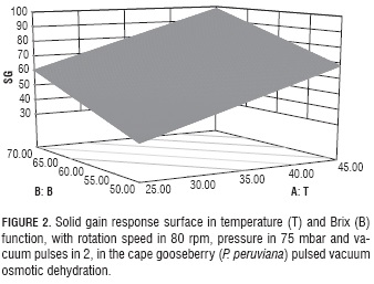 Equation 15 shows T has a positive effect on SG, which indicates this variable favors the entrance of solids in the fruit as an effect of its action on the diffusion coefficients (Alakali et al., 2006; Arreola and Rosas , 2007; Allali et al., 2010; Tortoe, 2010), while B had a negative effect, which is associated with the fact that high B values negatively affect the entrance of solids when favoring the creation of a barrier on the surface of the membranes of the product (Giraldo et al., 2003; Mujica - Paz et al., 2003; Ferrari y Hubinger, 2008). The VP factor had a significant positive effect over SG, which indicates the greater the number of applied vacuum pulses, the higher the gains in solids due to vacuum pulses provoke the opening of the fruit pores and the exit of entrained air. When the atmospheric pressure is restored, such pores are filled with the osmotic solution which affect the fruit solid gain (Huayamave and Cornejo, 2005; Arreola and Rosas, 2007). The P and B interaction had a positive effect on SG, possibly because the pressure reduction caused the expansion and exit of gas enclosed in the pores, and pores can be occupied by osmotic solution, thus increasing the mass transfer rate (Bekele and Ramaswamy, 2010), when increasing the vacuum this process increases too. On the other hand, the solution that entered the pores may exit along with the original liquid during the relaxation period at atmospheric pressure, but with concentrated solutions, the exit of the solute does not happen the same way, resulting in a higher SG (Mújica et al., 2003a). (Mújica et al., 2003b). To corroborate this behavior, note the graph for SG as a function of the more significant factors (T and B), V (80 rpm), VP (2) and pressure (75 mbar) values were noted (Fig. 2).