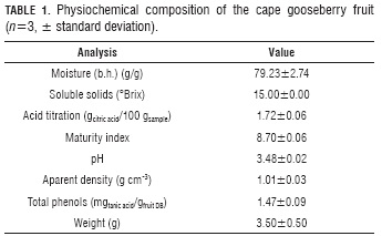Fresh cape gooseberry fruits (Physalis peruviana L.) were bought in a local market of Medellin, located at 6°13'55" N and 75°34'05" W. The origin of fruits were from farms at altitudes between 1,200 and 2,800 m a.s.l. Fruits with weights between 3 and 4 g and a soluble solid content between 14 and 15°Brix were selected, washed with alkaline detergent and disinfected with 4% quaternary ammonium; finally, they were peeled to facilitate mass transfer and physico-chemically characterized (AOAC, 1995) (Tab. 1).