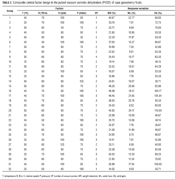 The response surface methodology (RSM) was applied to assess the effect of the factors: temperature (T: 25-45 °C), syrup solid concentration (B: 50-70 °Brix), rotation speed (S: 60-100 rpm), pressure (P: 60-100 mbar) and vacuum pulse (VP: 1-3) over the most important parameters of the cape gooseberry fruit PVOD process: weight reduction percentage (WR), water loss percentage (WL), and solid gain percentage (SG), according to the following Eqs. 1, 2 y 3: