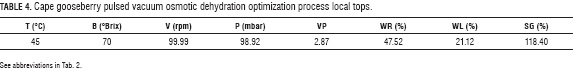 The objective of the current study was to optimize the OD at pulsed vacuum (PVOD) of the cape gooseberry (Physalis peruviana L.) by means of response surface methodology. Furthermore, mathematic models were fitted to describe the behavior of the system in terms of the PVOD kinetic.