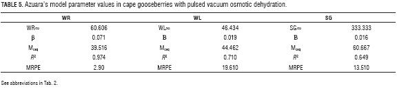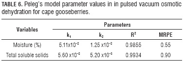 The R2 values (Tabs. 5 and 6), MRPE and analysis of graphic behavior (Figs. 3-9), showed the best adjust for the experiment data to the Peleg model, during cape gooseberry PVOD under current study conditions, followed by model derived from Fick's equation and finally by the Azuara model. Nevertheless, the Peleg model, as an empiric model, does not provide a deeper understanding of the phenomenon, while the two others do, which is very usefully to scale up process and to extrapolate results. Additionally, it must be considered generality involved in the phenomenological model derived from Fick's equation even without the best statistics. In any case, the excellent fit of Peleg model allow appreciate the application of this model in this process under condition set out in this study.