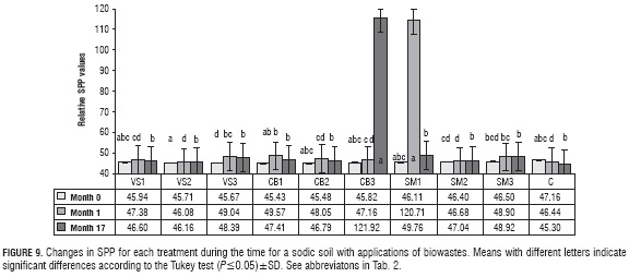 The evaluation of the SPP throughout the whole experiment showed that, in the control plots, the trend was to progressively decline over time, unlike with the biowastes, where, in all cases, this parameter increased, but only significantly with CB3 and SM1 at the seventeenth and first month, respectively (Fig. 9). This suggests that CB3 has a long-term effect on the soil productivity, rather than SM1, in which the SPP experienced a decline from the first to seventeenth month.