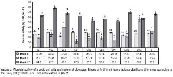 The biological properties of the soil, measured as the microbial activity, were not significantly affected by any biowaste, in comparison with the control plot. Although the degree of this activity tended to increase up to the seventeenth month, this could be attributed not only to the treatments but also to the growth of vegetal layer on the undisturbed plots. This explain the higher microbial activity in the control plots. Notably, CB decreased it at all three doses, unlike VS and SM, where this parameter went progressively increased with each dose. However, at the end of the experiment, the microbial activity reached a non-significant steady value throughout all of the treatments and control (Fig. 2). Barbarick et al. (2004), pointed out that the control and biosolids treatments in shrublands had statistically the same qCO. at 6 years after application, indicating that biosolids did not produce increased adverse stress on the microbial population. The increase in the CO. production over time observed in this study could be attributed to a lesser microbial C biomass or to a microbial stress induced by the amount of added biowastes. This differed from that indicated by Montenegro-Gómez et al. (2009), whose findings showed a decrease over time in CO. production in a mollisol treated with vinasse.