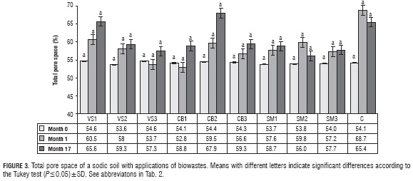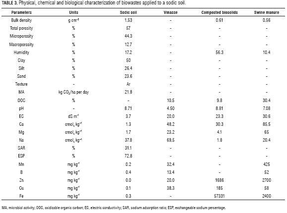 The EC with VS exhibited a growing pattern at the seventeenth month of the evaluation; one explanation is that its inherent content of sulfates, sodium and phosphates contributed to the increase in the EC in the plots treated with this biowaste. Gemtos et al. (1999) did not found a significant variation in this parameter by adding two levels of vinasse to a clayey and a silty clay loam soil from Greece. However, Alfaro and Ocampo-Cinchilla (2008), who worked with two levels of vinasse in a vertisol, noticed an important increase in the EC, from 0.29 to 16.49 mS.cm-1. The low EC values achieved with CB3 and SM1 reflected in their effect on the ESP and SAR, indicating that these two biowastes have an important capacity to alleviate the effects of sodicity in soils. The latter improves the soil structure by increasing the aggregate stability and decreasing the bulk density (Mondal et al., 2015). For the salinized soil, this improvement was primarily due to a reduction in the ESP (García-Orenes et al., 2005).