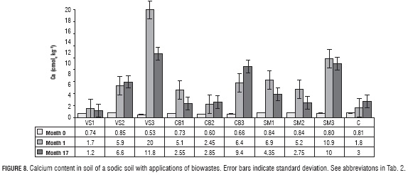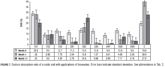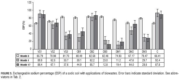 Concerning the chemical properties, it was observed that the addition of biowastes affected several parameters, which could change the characterization of the soil as sodic. The ESP in the control plots remained stable at the two samplings dates, at values of 87.8-92.4%. VS1 and CB2 did not change significantly the ESP, but at their highest doses this property went consistently lower. This effect was also observed when using SM1 (Fig. 5).