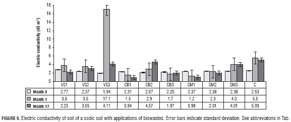 The EC of the soil showed no significant changes in the control plots, but it went progressively lower in the plots with decreasing doses of SM. The inverse effect was observed with VS, particularly at the seventeenth month of the evaluation. The CB exhibited an irregular trend, but it decreased the EC below the control in two of the applied doses. Fig. 6.