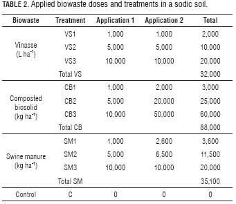 Each biowaste (composted biosolid, swine manure and vinasse) had three levels of dose application, for ten treatments, including the control, distributed in a completely randomized design with three replicates. The doses were calculated according to the availability of each biowaste in the source and dividing them by three (Tab. 2). The time between each application of the biowastes was approximately 2 months, the first one in early March, 2012 and the second one mid-May, 2012.