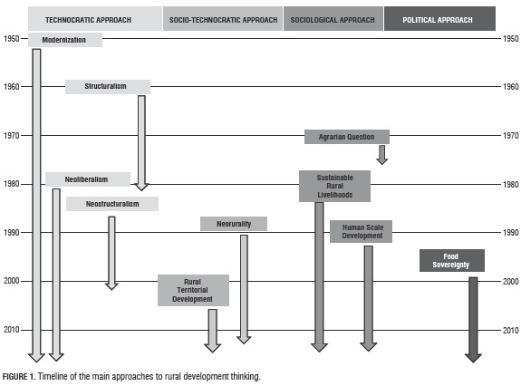 To best understand the main rural development approaches, this paper focuses on four different approaches. Firstly, the technocratic, which takes into consideration five main perspectives: Modernization of Agricultural Production, Structuralism - Cepalino and dependence theory -, Neoliberalism, and Neo-structuralism. Secondly, the sociological approach, which highlight at least four well-defined notions: The Agrarian Question, Sustainable Rural Livelihood, and Human Scale Development. Between them, there is the Socio-Technocratic approach with Rural Territorial Development and New Rurality perspectives. Finally, the political approach based on The Food Sovereignty perspective.