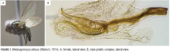 Characteristics used to recognize this genus can be found in Shi and Gaimari (2015). Melanagromyza obtusa (Fig. 1) is characterized by a green-coppery color; ocellar triangle green, well developed, anteriorly limiting with the margin of the lunule, and with its anterior edge blunt and flat; fronto-orbital bristles numerous, with the anterior ones proclinate; arista long, with conspicuos pubescence; wing length 2.4 to 2.8 mm; hypandrium and aedeagal apodeme long; apodeme of the hypandrium very long. Projection at tip of epandrium rounded, with long hairs; aedeagus hyaline; basiphallus with unusual long side arms, which are extending up to the distiphallus; dorsal bridge of basiphallus seems to be missing (Malloch, 1914; Spencer, 1961, 1973; Dempewolf, 2004).