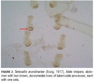 Genus Takecallis Matsumura, particularly T. taiwana (Takahashi), was recorded for the first time in South America by Foureaux and Kato (1999), found in Minas Gerais (Brazil), on Phyllostachyscf. aurea (Poaceae). The same year, Noemberg et al. (1999) reported T. arundinariae, in São Paulo (Brazil), collected on Dendroclamussp. and Merostachys sp. (Poaceae). Further south on the continent, in the metropolitan area of Chile, Gonzales et al. (2000) found T. taiwana on Bambusoideae (Poaceae). For Argentina (provinces of Cordoba, Mendoza and Buenos Aires city), Delfino (2001) recorded T. arundinariae for the first time, collected on Arundinaria sp. (Poaceae), and on another unidentified bamboo. Meanwhile, Saini et al. (2002) records T. taiwana for Mendoza (Argentina), on an unidentified bamboo. Ortego et al. (2004) recorded T. arundinariae for Chile (San Fernando province of Rancagua), on an unidentified bamboo. Delfino and Buffa (2008) identified two species of aphids for Argentina, on Phyllostachys aurea (Poaceae), a plant of ornamental importance.
