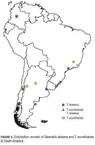We do not know with certainty when these aphid species were introduced to the southern part of the South American continent. We can infer that their arrival was through transport of their host plants (Bambusoideae). It can be said that weather conditions do not limit the presence of T. arundinariae and T. taiwana, given the wide variety of environments in the countries where they have been found. Apparently, these species have no difficulty in establishing colonies in new environments and it can be assumed that they exist throughout the continent (Fig. 3).