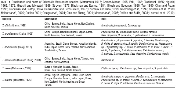 The genus Takecallis is represented by six, mostly Oriental and Palaearctic species, but several species are now widely distributed (Tab. 1). Favret et al. (2010) observed T. taiwana and inferred the presence of T. arundinariae (Essig, 1917) in the Great Smoky Mountains National Park, USA. All Takecallis species have been collected on species of bamboo (Poaceae: Bambusoideae). In some parts of Colombia, these plants are of ornamental importance, used as living fences or to conserve natural aquifers (Salas, 2006). The life cycle of Takecallis is apparently anholocyclic (Qiao and Zhang, 2004). Adults are mostly known from alate viviparae (Qiao and Zhang, 2004). Ghosh (1986), when describing T. affinis, reported two apterous viviparae collected from Arundinaria jounsarensis in association with a single alate vivipara, and vagrant alate males. LeClant (1966) observed alate viviparae throughout the year and collected ovipara from Arundinaria sp. in Montpellier.