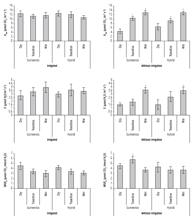 Figure 2 shows the behavior of the materials evaluated in the two fields (irrigated and non-irrigated) over time during three different seasons (dry, transitional and wet seasons) with respect to photosynthesis (Asat) and water-use effi ciency to photosynthesis (WUEp). Significant differences in photosynthesis were found between the irrigated and non-irrigated treatments in the dry season for both E. guineensis and the hybrid. During the transitional season there were also differences in the hybrid but not in E. guineensis. No differences were found between the two treatments during the wet season. In a separate evaluation of the two fields, with an average Asat of 11.81±2.4 vmol CO2 m-2 s-1 for E. guineensis and 11.64±2.3 |imol CO2 mf2 s-1 for the hybrid, no significant differences between materials over time were found in the irrigated field. However, significant differences were found among seasons in the field without irrigation. The Asat averages reported for E. guineensis were 4.52±1.08; 10.41±0.86 and 13.14±0.99 µmol CO2 m-2 s-1, in the dry, transitional and wet seasons, respectively, and 6.52± 1.45; 9.44±1.07 and 12.98±0.89 on average for the hybrid during the same seasons. However, no statistical significant diffe rences were found between the two materials.