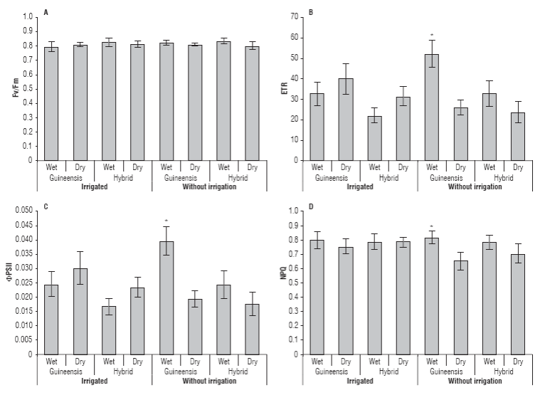 The maximum quantum efficiency (Fv/Fm) showed no sig nificant differences in any of the comparisons (Fig. 3). The average value was 0.81±0.02, and no trends related to the field or the seasons were found. In the field with irrigation, the non-photochemical quenching (NPQ) of the palms showed no significant variations and was slightly higher in both materials during the wet season. However, the NPQ differences among seasons were found in the field with no irrigation for both materials and reached the highest values during the wet season. The photochemical efficiency of photosystem II (0PII) and the electron transfer rate (ETR) responded similarly. These variables are closely related and no significant differences were found among seasons for E. guineensis in the field with irrigation. However, the values for the wet season were lower than those found in the dry season.